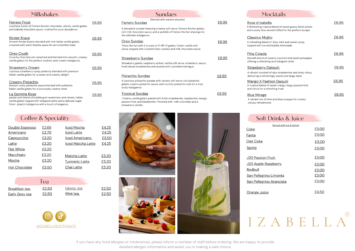 At Izabella, you’ll discover an array of enticing milkshakes to quench your thirst, each crafted with care and creativity. Treat yourself to the Ferrero Frost or the deliciously layered Oreo Crush, both priced at just £6.95. Each sip offers a creamy texture that envelops your taste buds in sweet, nostalgic flavors. If you’re looking for a refreshing escape from the ordinary, their mocktails are equally tempting; the Piña Colada and Strawberry Daiquiri, both also £6.95, transport you to a tropical paradise with every sip.